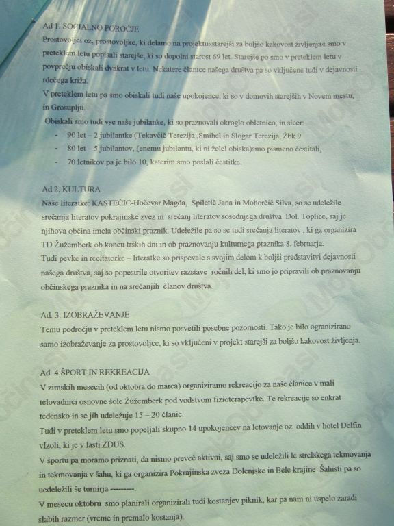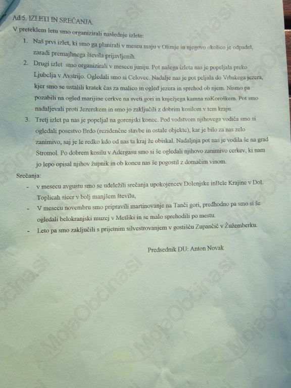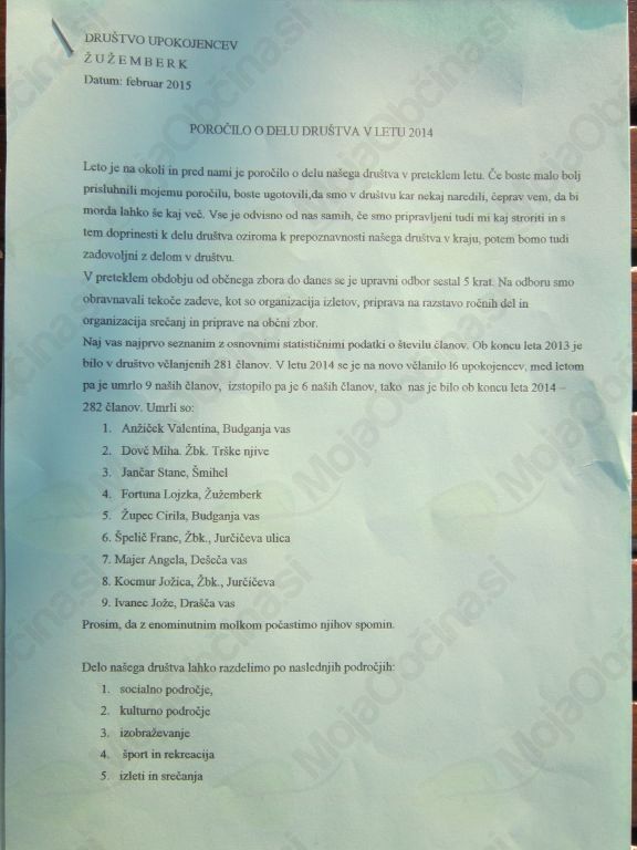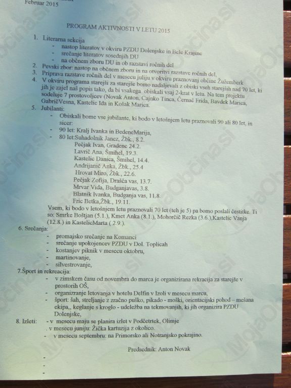 Za prijeten kulturni program so na praznični dan poskrbeli žužemberški osnovnošolci ter člani in članice društva s pesmijo in recitacijami. Sam občni zbor pa je potekal v prisrčni atmosferi, s pozdravnim nagovorom predsednika. Z minuto molka je bil počaščen spomin na preminule člane društva. Po podanih poročilih o preteklem letu in dejavnostih društva je bil sprejet letni plan dela društva. Nekaj članov je dobilo nove funkcije, dosedanje aktivne člane društva pa je predsednik še posebno pohvalil v upanju, da bo naslednje leto vsaj tako aktivno. Besedo so dobili tudi gosti na današnjem občnem zboru-župan občine Žužemberk Franc Škufca, predsedniki sosednjih upokojenskih društev, predsednik regijske organizacije upokojencev ter ostali gosti.