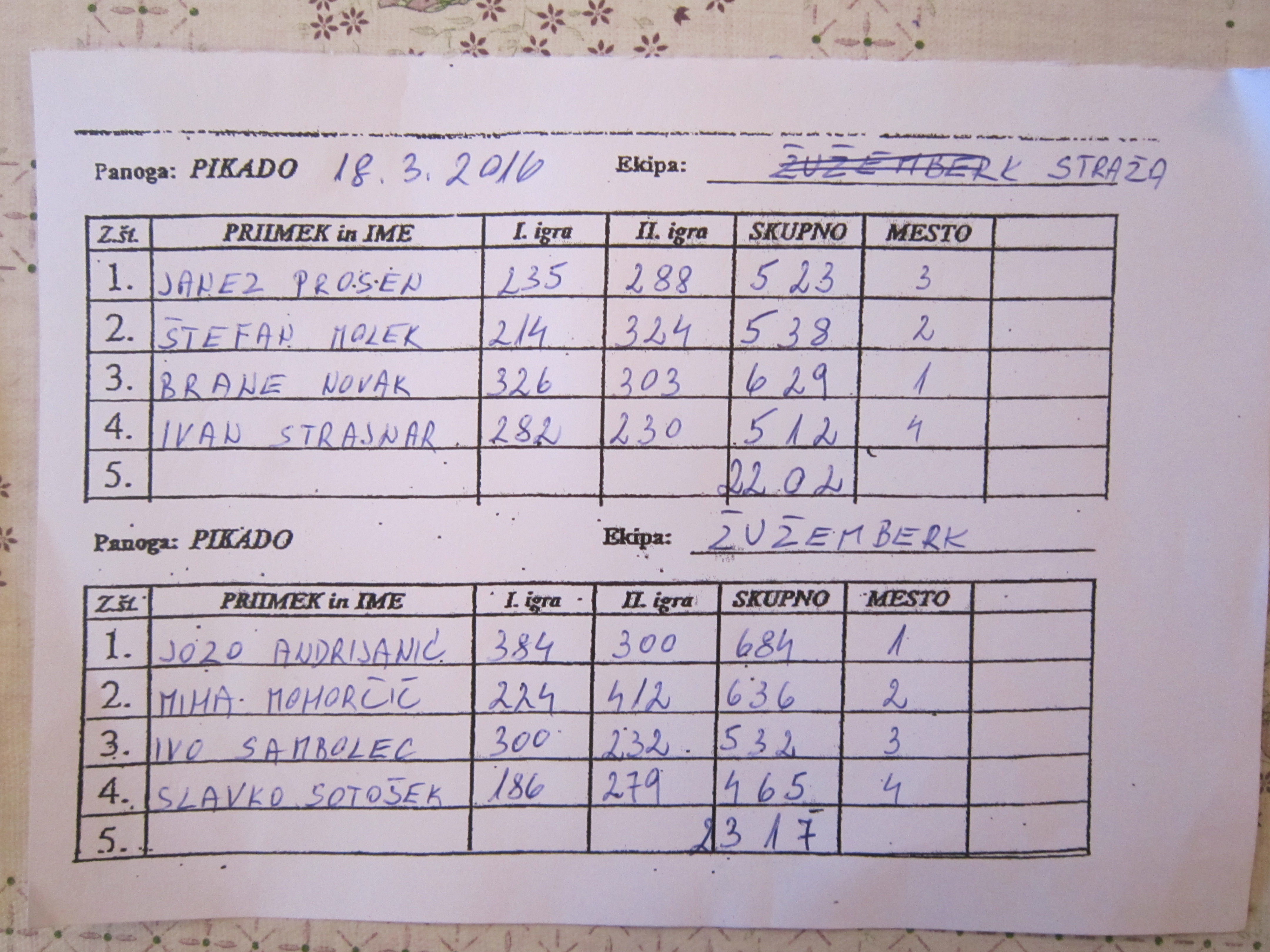 Po manjšem organizacijskem zapletu, nam je v dopoldanskem času uspela izvedba tekmovanja v pikadu med upokojenci DU Straža in DU Žužemberk.Tokrat smo imeli Žužemberčani več sreče. Še enkrat se članom društva upokojencev Straža opravičujemo za spodrsljaj v organizaciji tekme. Več na fotografijah.