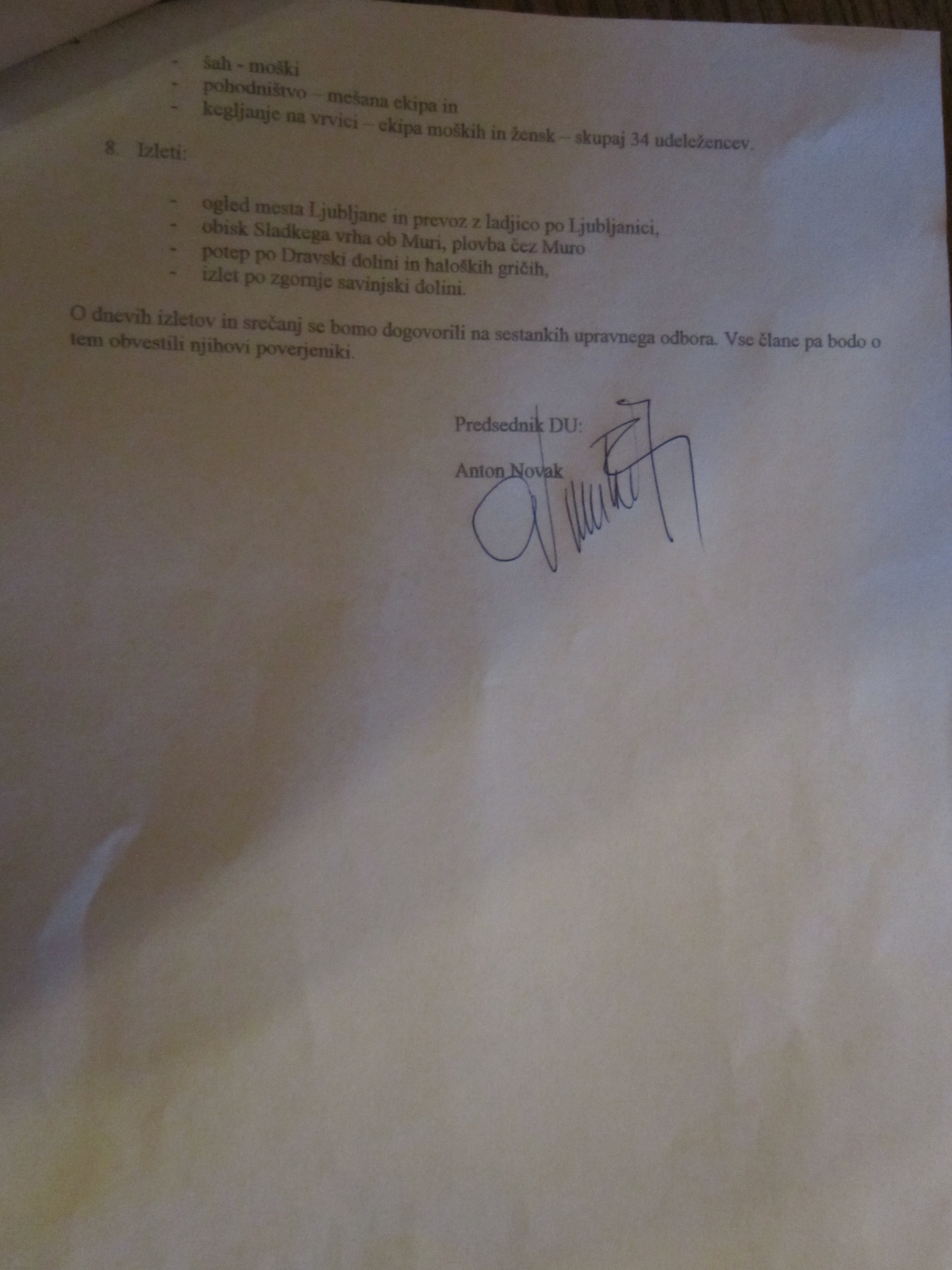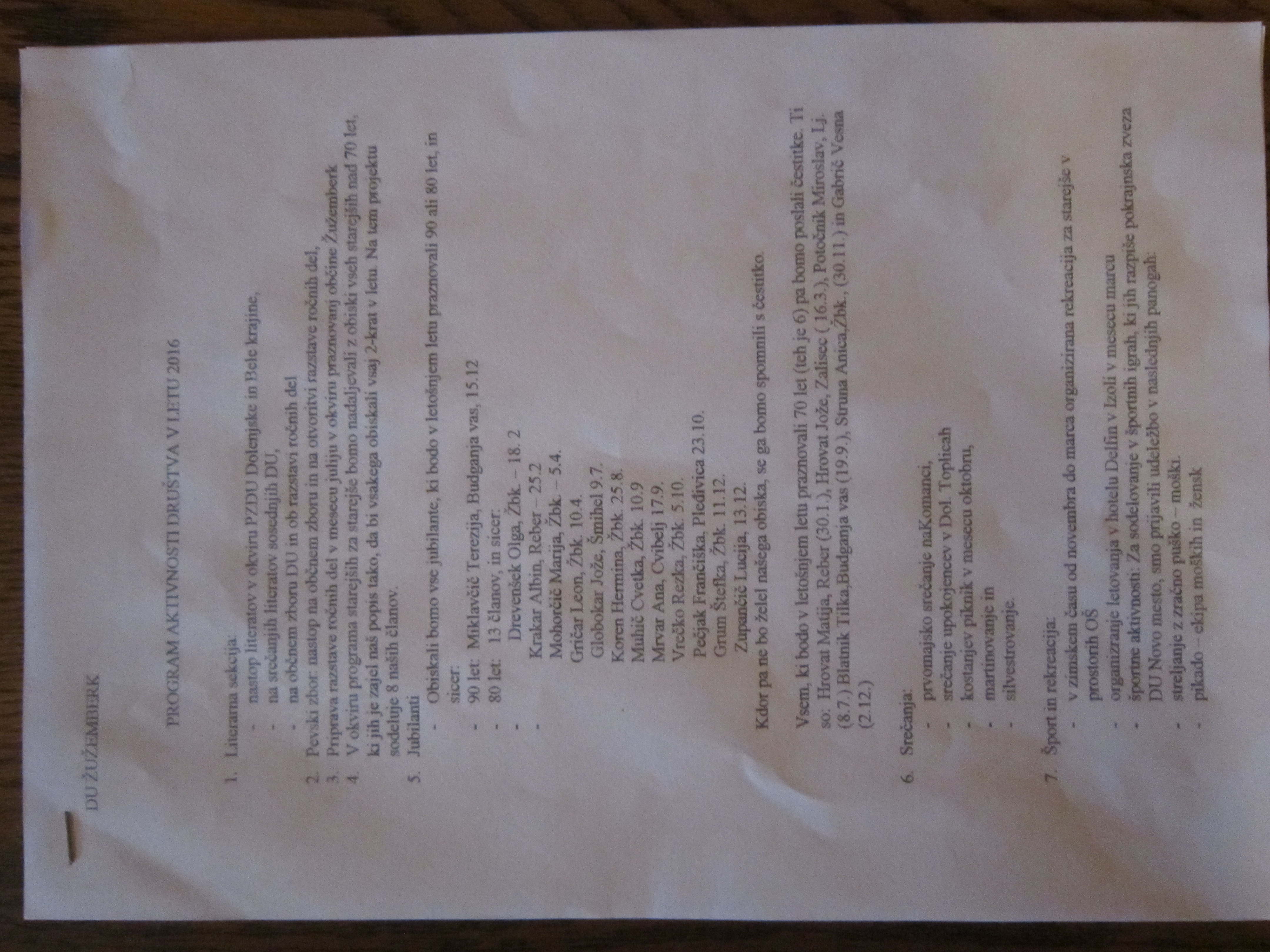 Člani društva upokojencev Žužemberk so se v nedeljo, 6.3.2016 zbrali v gostišču Zupančič na rednem letnem občnem zboru.Najprej je sledil kulturni program, po izvolitvi delovnega predsedstva so bila podana poročila: predsednika, blagajnika, tajnice, nadzornega odbora, sekcije za šport, predstavnice prostovoljne skupine, sestavljene iz dvorskih in žužemberških upokojencev, ki v občini obiskujejo naše upokojence. Besedo so imeli tudi gostje, med katerimi je bil naš župan, ter član društva upokojencev Trebnje. V svoji sredini smo nazdravili tudi članoma zlatoporočencema.Ob ugotovitvah in pohvalah dela upokojencev je sledil še plan dela za leto 2016, ki zajema tudi ureditev občinskih prosotrov, kjer se družijo upokojenci. Zaključek je potekal ob dobri kapljici in hrani gostišča Zupančič. Jole Adrijanić