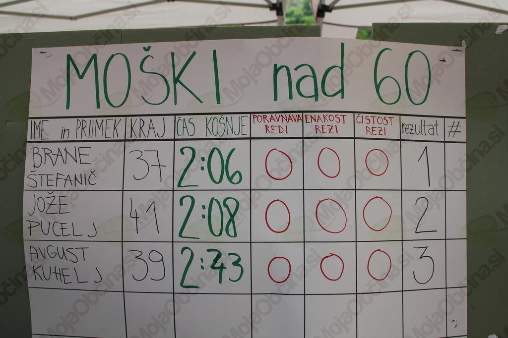 Komisija je polegi hitrosti košnje ocenjevala tudi poravnavo redi, enakost rezi ter ne nazadnje tudi čistost rezi pokošene trave. Da je bila naloga še malenkost težja je tekmovalcem zagodel nevihtni oblak, ki je prinesel nekaj dežnih kapljic. Brez strahu so se podali na svoje parcele in odlično opravili svoje delo.