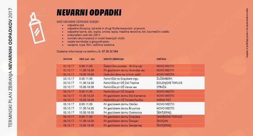 Komunala Novo mesto obvešča občane občine Žužemberk,  da bodo v torek 3. oktobra zbirali  nevarne odpadke iz gospodinjstev. Zbirno mesto je na parkirišču na Grajskem Trgu od 8:00 do 11:00 ure. Sem sodijo odpadna olja, škropiva, zdravila, barve, laki, lepila, kozmetični izdelki, svinčeni akumulatorji, baterijski vložki, filtri, kemikalije iz gospodinjstev in onesnaženi sodi. Dodatne informacije dobite na telefonski številki 39-32 564.