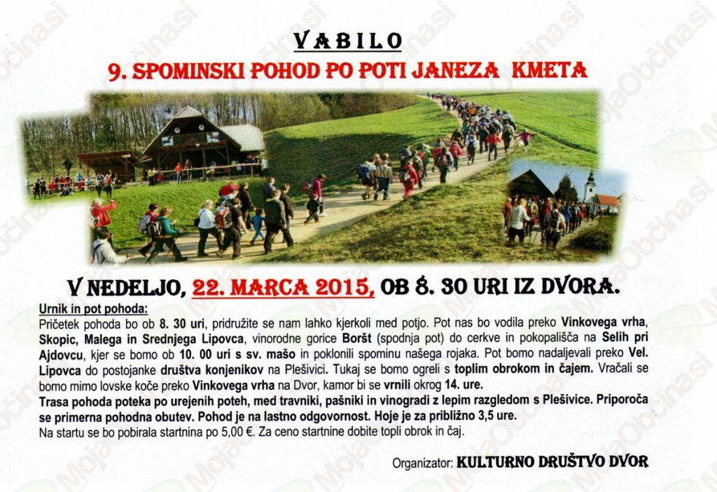 Kulturno društvo Dvor bo v nedeljo 22. marca pripravilo 9. spominski pohod v spomin na velikega Suhokranjca, duhovnika in pisatelja Janeza Kmeta. Pričetek pohoda bo iz Dvora ob 8.30 uri.