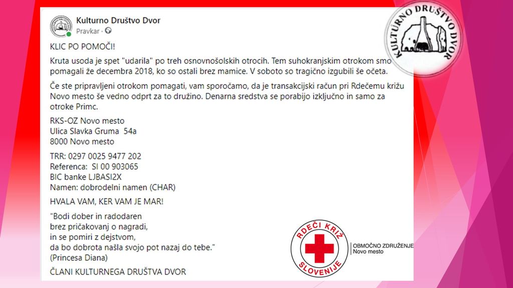 Če ste pripravljeni otrokom pomagati, vam sporočamo, da je transakcijski račun pri Rdečemu križu Novo mesto še vedno odprt za to družino. Denarna sredstva se porabijo izključno in samo za otroke Primc.