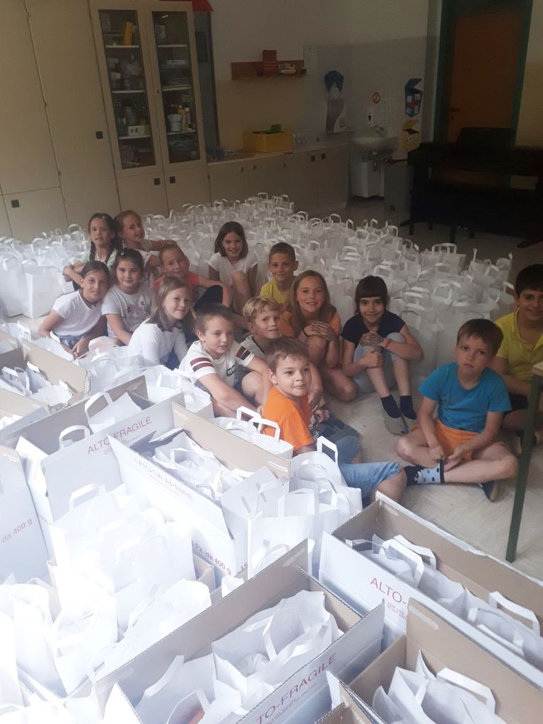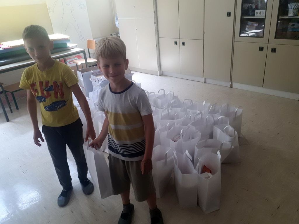 Robo, ki jo je predsednica KORKa Žužemberk Alenka Sajovec, pripeljala iz OZRK Novega mesta, so učenci 4. razreda pomagali prinesti v razred tretješolcev. Ti so pod okriljem razredničarke Alenke Pavlin pripravili pakete. Vsak paket je vseboval vrečko piškotov, napitek v prahu in zloženko s koristnimi informacijami, ki bo starostnikom v pomoč. Otroci so se maksimalno potrudili s pripravljanjem paketov in tudi pri razdeljevanju teh paketov, tako da so jih nekateri starostniki že prejeli, nekateri jih v kratkem še bodo.