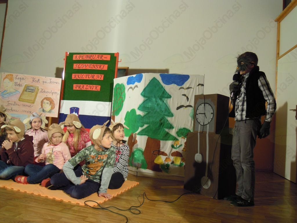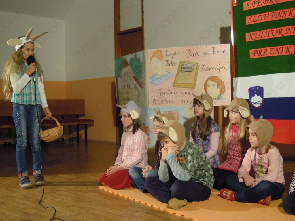 Po zapeti Zdravljici smo učenci predstavili življenjepis Franceta Prešerna. Tamara Hočevar iz 4. r. pa je deklamirala pesem Povodni mož. Nismo pozabili na ljudsko izročilo in smo zapeli pesmici Lisička je prav zvita zver in Šmentana muha. V dramskem prizorčku smo zaigrali pravljico Volk in sedem kozličkov. Na prireditvi smo predstavili tudi projekt o zdravilnih rastlinah o katerih smo postavili tudi razstavo. Med prireditvijo je ravnateljica ga. Mira Kovač podelila 6 priznanj in 1 nagrado za dosežke na šolskem likovnem natečaju z naslovom Življenje je lepo.
