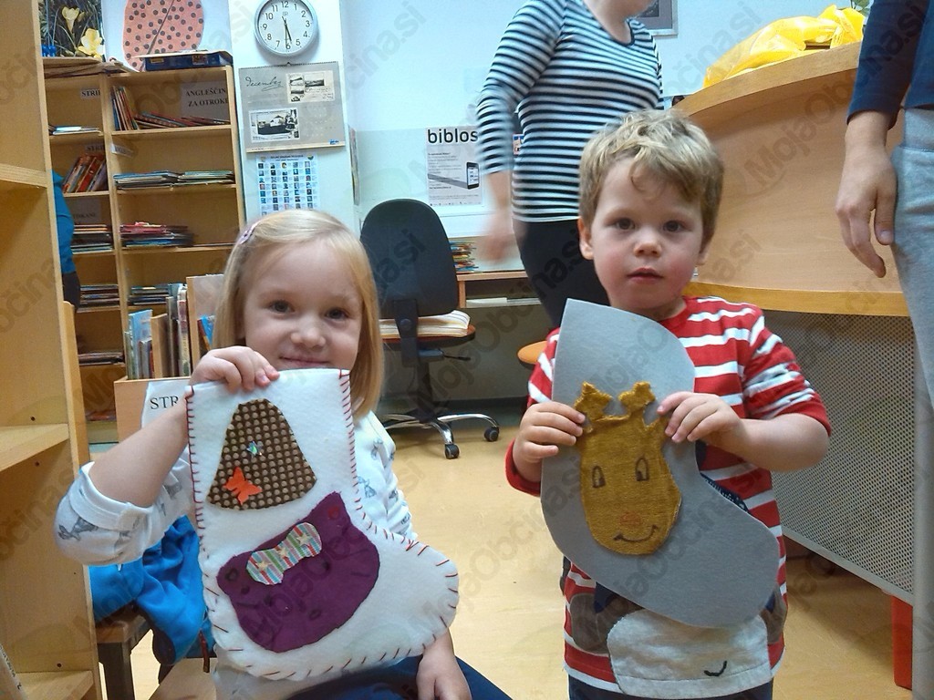 Eden skorajda nepogrešljivih delčkov celotnega prazničnega vzdušja je tudi škorenjček, ki ga obesimo na vidno mesto in ga napolnimo z darili s katerimi bomo razveselili naše najdražje. Otroci so s svojo brezmejno domišljijo okrasili škorenjčke iz filca z jelenčki, muckami, zvončki in bleščicami.